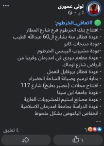 تناول عدد من الاحداث خلال الاسبوع الماضي وعودة مجموعة من الانشطة التجارية للحركة وانعاش الحياة بالعاصمة الخرطوم وابرزها اعادة افتتاح بنك الخرطوم بشارع المطار.