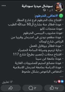 خلال الساعات الماضية انتشر بشكل كبير وسط صفحات السوشال ميديا السودانية هاشتاق تعافي الخرطوم